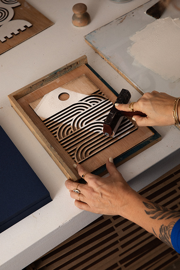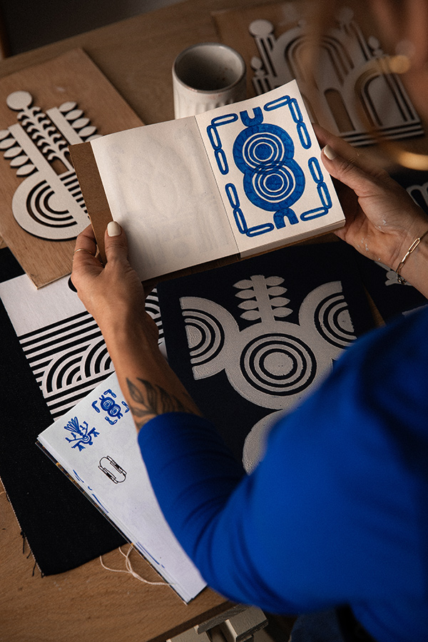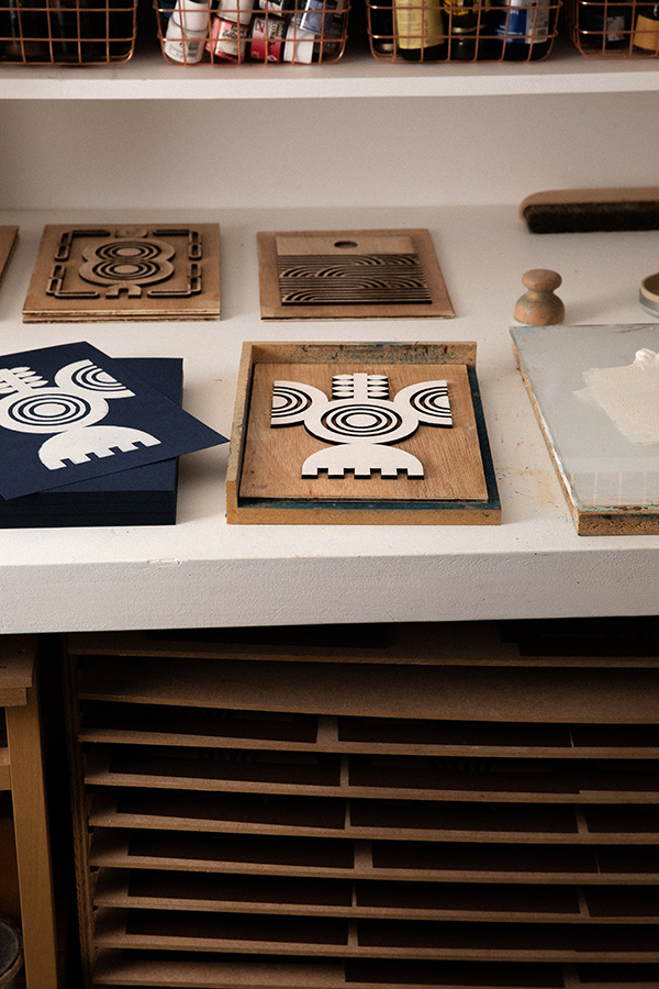 Une écriture logographique dessinée à la main, puis estampée dans son atelier du Pays basque, comme une empreinte du geste et de la pensée.