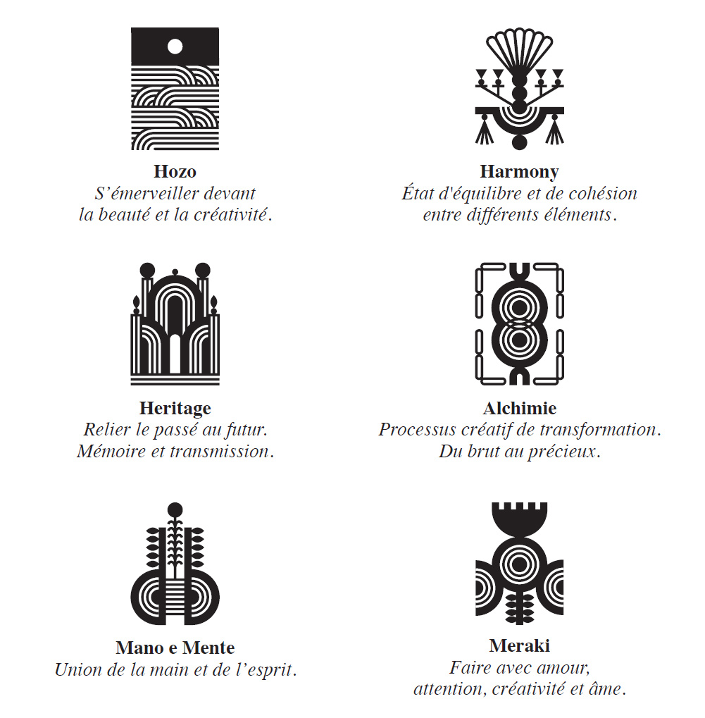Cette série d’idéogrammes originaux a été imaginée par l’artiste Koralie Carmen Flores pour InLuce, autour de valeurs communes telles que l’attention au geste, la transmission du savoir-faire, l’équilibre entre intuition et technique, et la transformation créative.